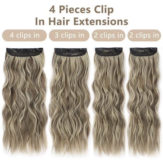 4 Pcs Set Gold High-Quality Wavy Clip-In Hair Extensions Set - 50cm, 200g, Synthetic Fiber - Voluminous Beach Waves for Instant Hair Makeover