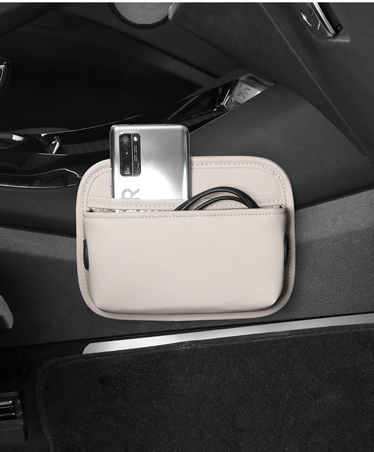 Off White PU Leather Car Storage Organizer with Dual Charging Holes and Inner Mesh Pocket, Multi-functional Door Handle Hanging Bag for Phones and Accessories, Lightweight and Durable