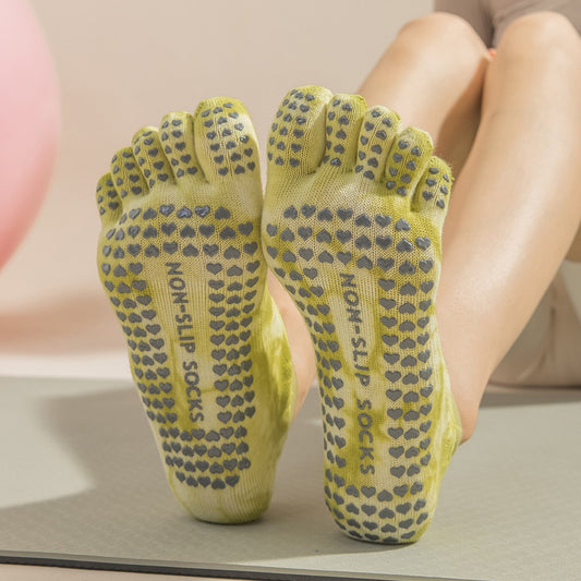 2 Pairs Light Green Tie-Dye Non-Slip Yoga Socks for Women - Five-Toe Cotton Blend Socks for Pilates and Indoor Sports