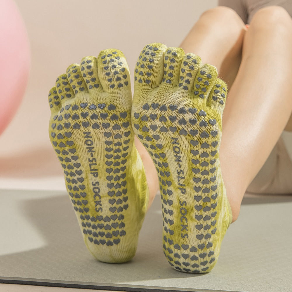 2 Pairs Green Tie-Dye Non-Slip Yoga Socks for Women - Five-Toe Cotton Blend Socks for Pilates and Indoor Sports
