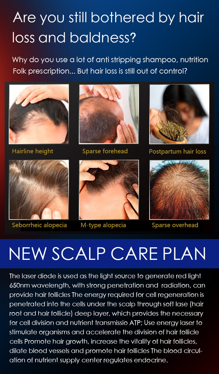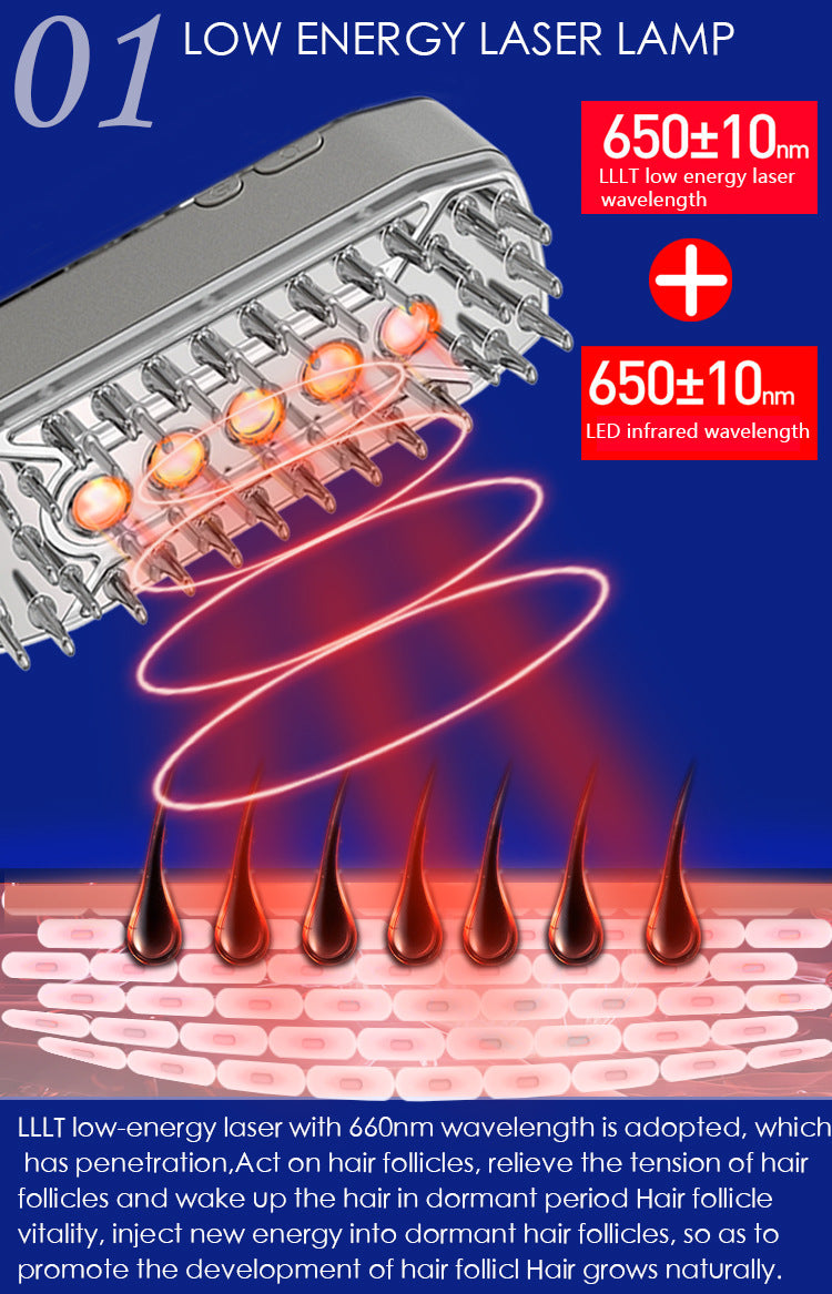 • Low-Energy Laser Lamp (LLLT + Red Light): Utilizes 650±10nm LLLT low-energy laser and 650±10nm LED infrared wavelength to penetrate the scalp, act on hair follicles, relieve tension, and promote the development of dormant hair follicles.