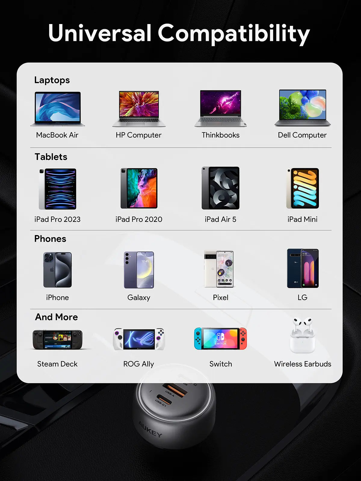 The Aukey Pathfinder Mix 3 Fast Charging Car Charger 66W (CC-P1) is a high-performance charger designed for fast, efficient charging on the go. With a total output of 66W, it can rapidly charge multiple devices, including smartphones, tablets, and other USB-powered electronics. Equipped with both USB-C and USB-A ports, this charger offers versatile compatibility for various devices. Its compact design ensures it takes up minimal space in your car, and built-in safety features protect against overheating, overcharging, and short circuits, making it a reliable solution for charging while traveling.