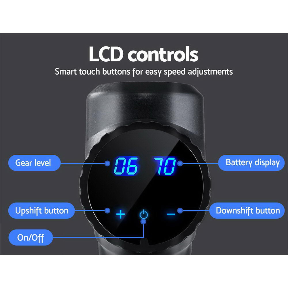 Chronic muscle pains? Hardcore gym junkie? Office job with long working hours? Recovering from an accident? Whatever your situation, our Everfit Percussion Massage Gun provides customised in the comfort of your own home, without the need to visit luxury spas. The powerful 20V brushless high-torque motor with closed-loop control operates quietly and provides rapid bursts of pressure penetrating 12mm deep into your muscle tissues at up to 4000 percussions per minute. The massage gun is powered by a rechargeable lithium battery that lasts up to 8 hours so that you can forget to recharge once in a while and the non-slip rubber handle provides a comfortable grip to reduce hand fatigue. Percussion speed can be easily adjusted using the intuitive LCD display with smart touch controls and there are 30 speed levels to suit various purposes from simply waking up your muscles to relieving lactic acid and assisting muscle recovery after exercising, or even intense professional-level massages. And with the six interchangeable head attachments for targeted relief (round, fork, bullet, flat, Pneumatic and conical heads), you are ensured of a fully customised massage.