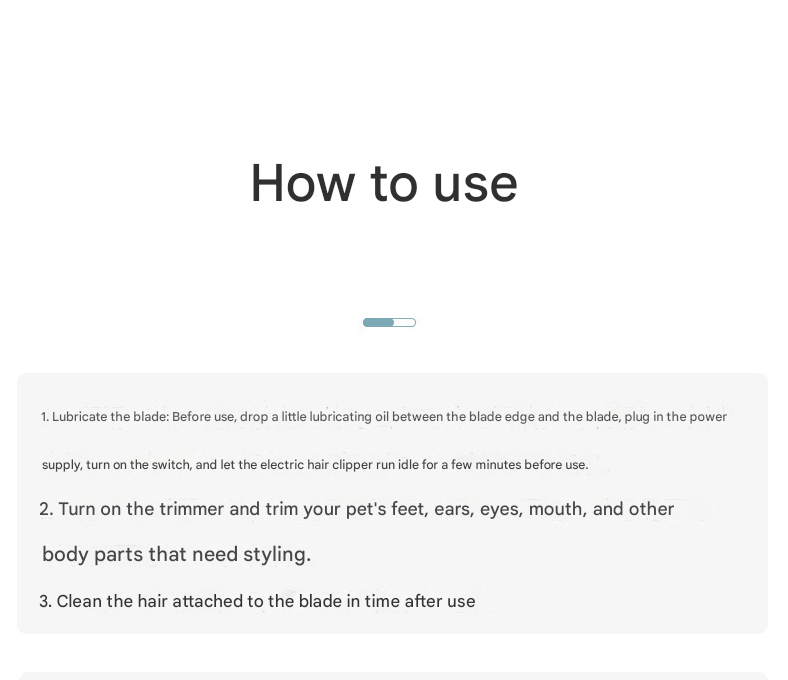 • 2. Gently turn on the trimmer and carefully trim the desired areas on your pet's paws, face, or ears.