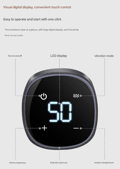 • User-Friendly Operation: Simple one-touch controls for power, temperature adjustment, and vibration modes, all clearly visible on the bright LED display.