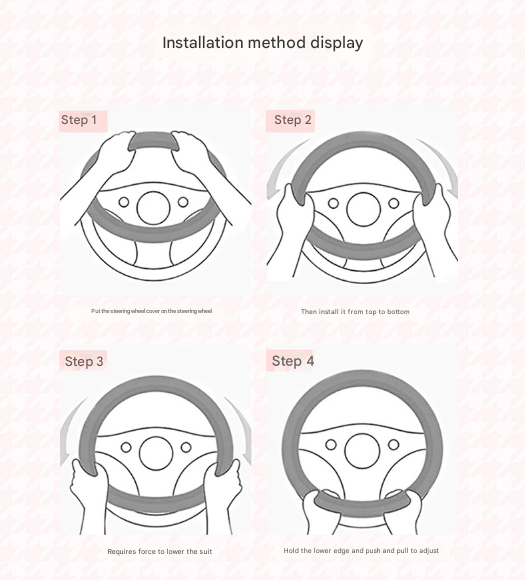Installation Tip: For an easy installation, warm up the steering wheel cover slightly (e.g., in the sun) to make it more pliable. Start by fitting it on the top of the steering wheel and then stretch it down evenly over the sides and bottom.