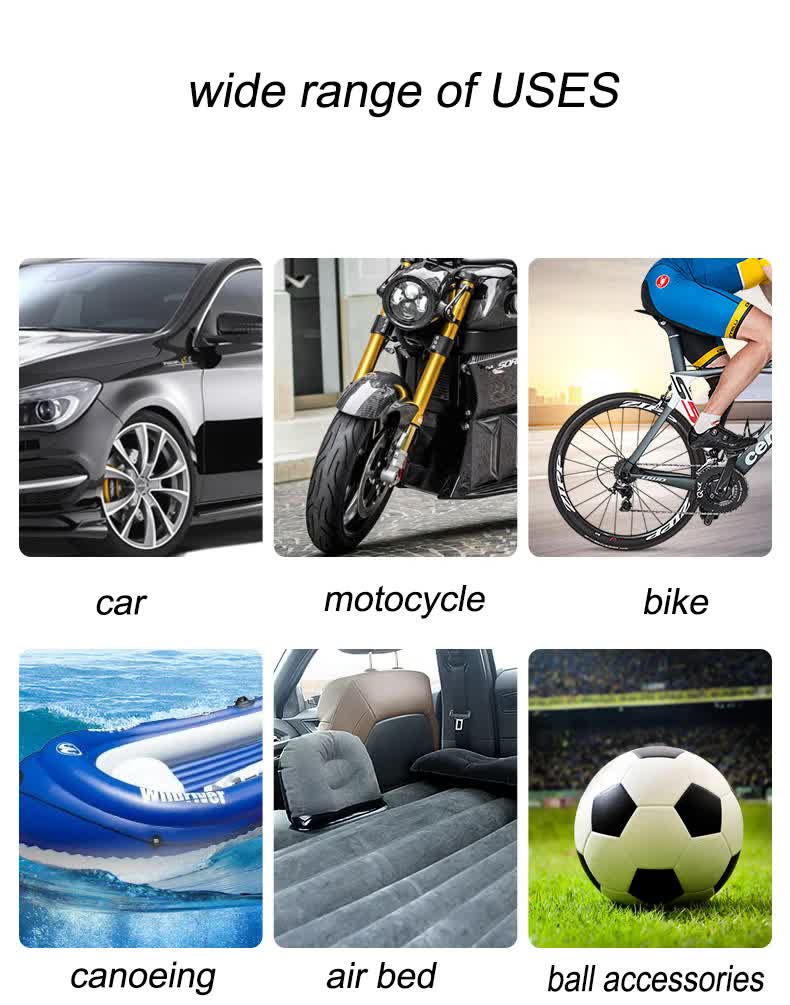 • Multi-Purpose Use: Includes a set of nozzles suitable for inflating car tires, motorcycles, bicycles, sports balls, inflatable boats, and more.
