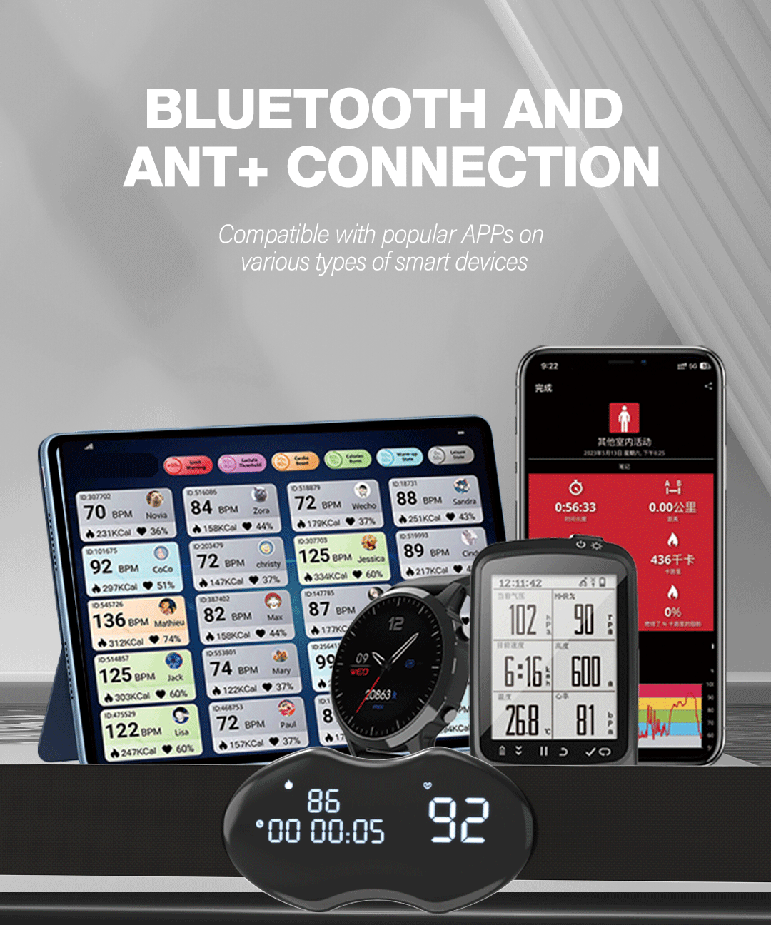 • Dual Wireless Technology: Features both BLE 5.0 and ANT+ for wide compatibility with smartphones, smartwatches, bike computers, and popular fitness apps.
